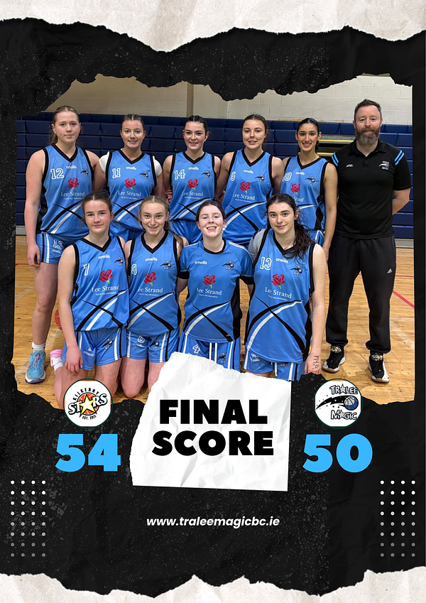 Aimee Turner led the scoring for Tralee Magic with 13 points, including three three-pointers, while Muireann Teahan added 11. Emily Flynn scored 7, Lauren Lawlor finished with 6, and Evie O’Sullivan and Gracie O’Sullivan both chipped in with 4. Priya O’Donovan added 3 points and Anna O’Sullivan scored 2. Sophie Mitchell and Abby Crowley also made a big impact with the energy they brought at both ends of the floor, applying strong defensive pressure, getting after every ball, and helping to lift Magic’s intensity with their off-the-ball work.